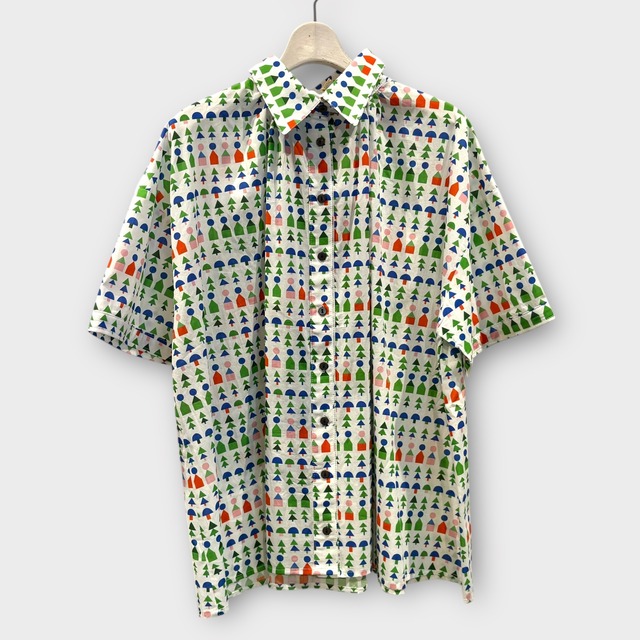 SANDY 森柄ギャザーシャツ ポップな森柄。レギュラーカラーにギャザーの入ったコットンシャツです。 <Size> F 肩幅60cm 身幅72cm 袖丈19cm 着丈66cm <Material> Cotton 100% 〈Color〉 オフホワイト