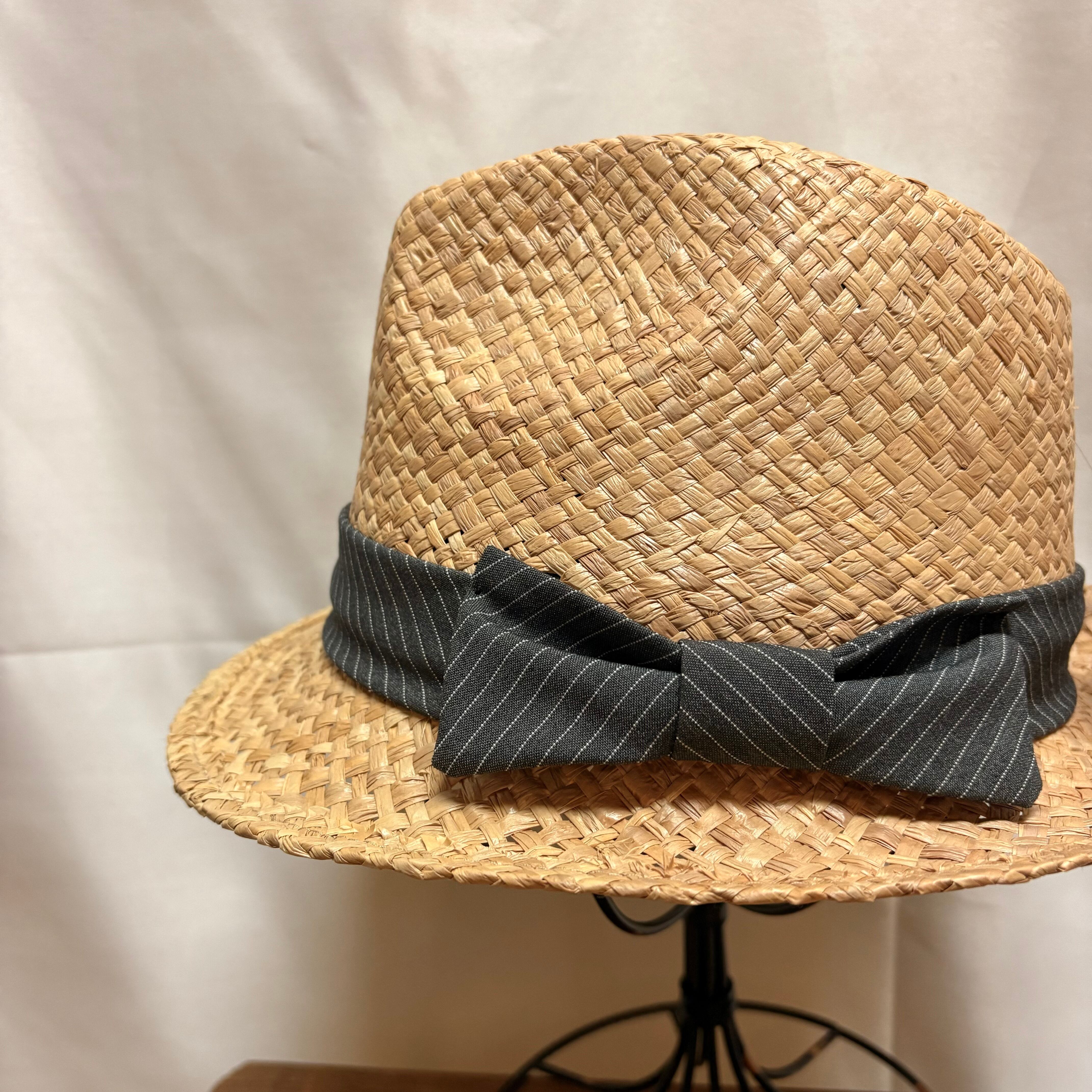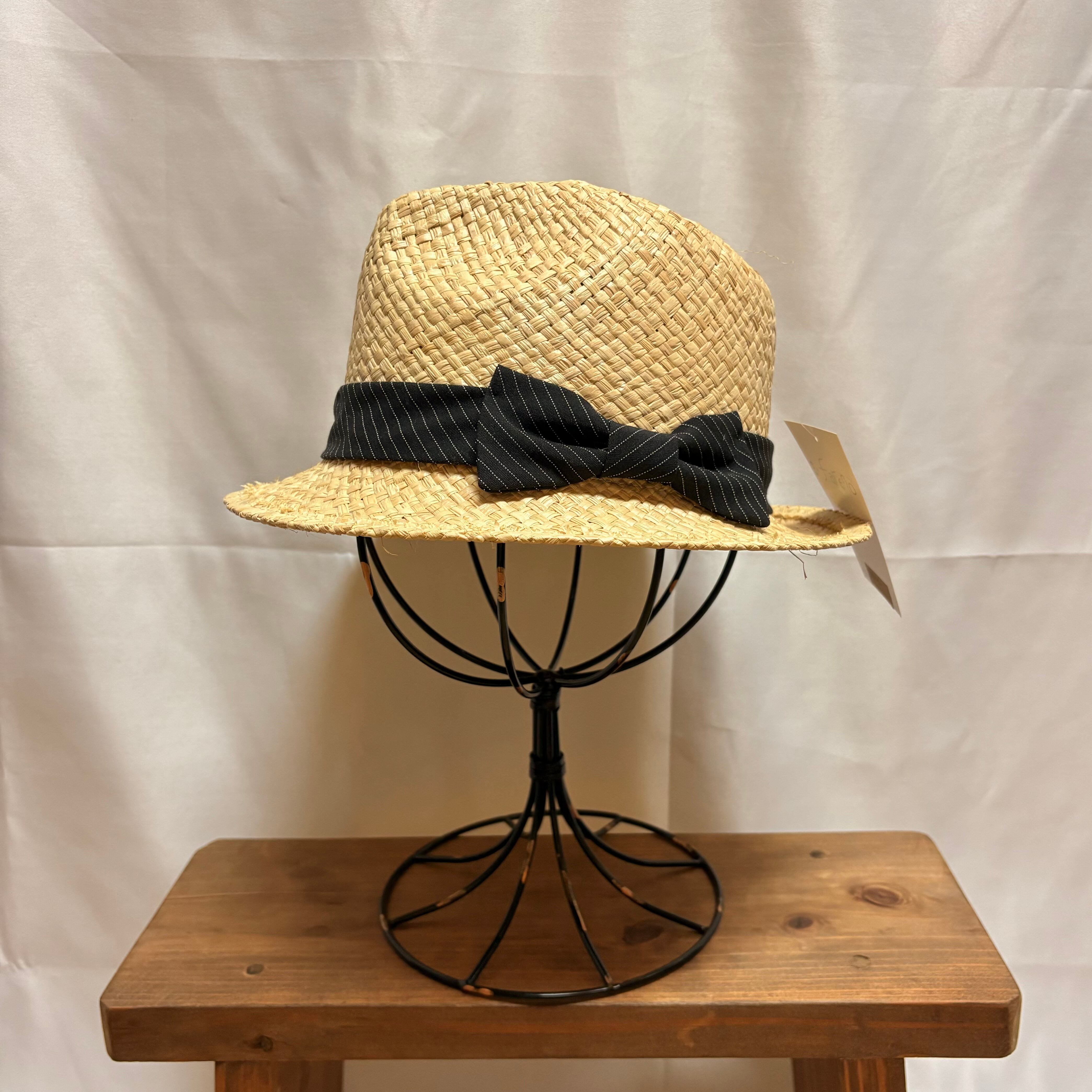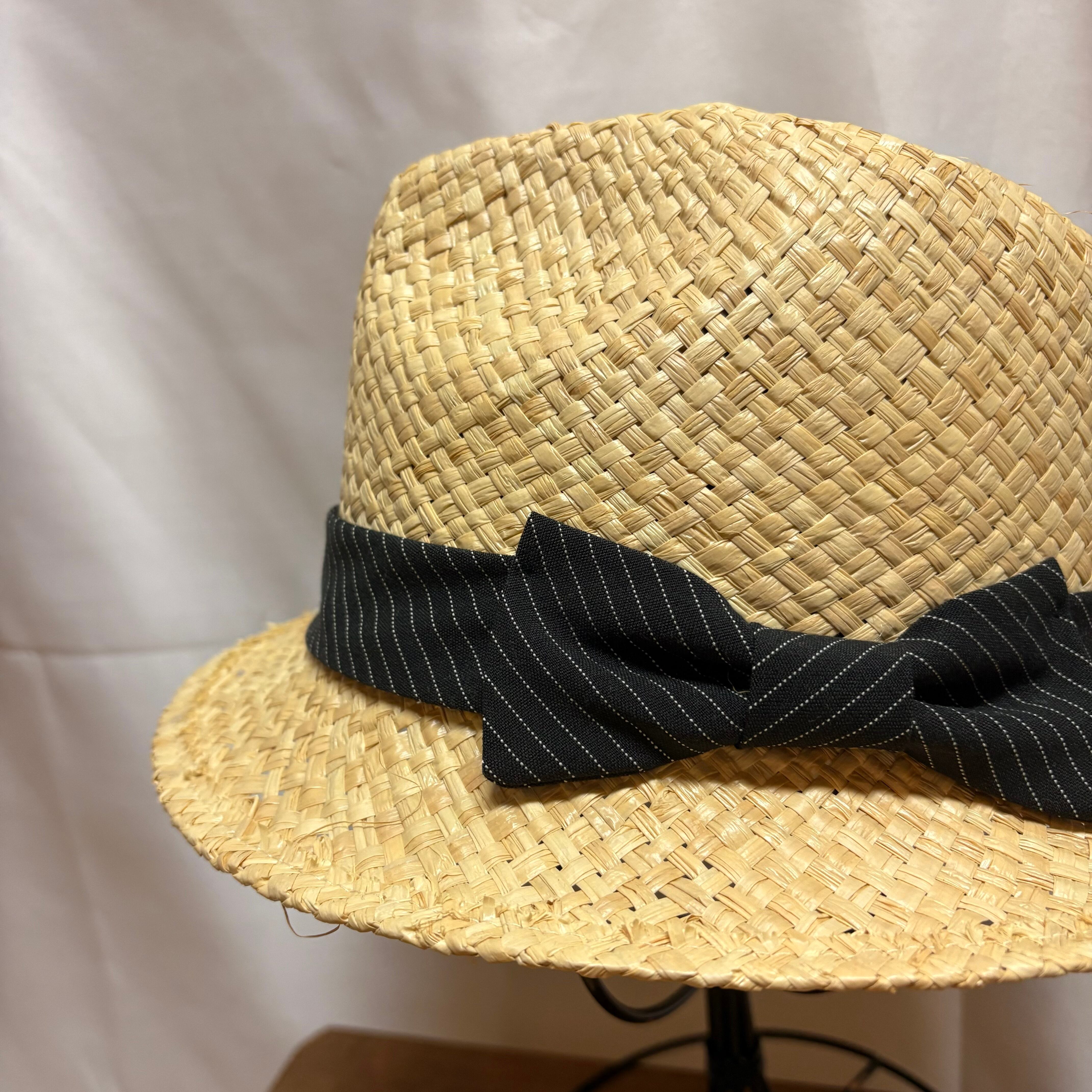 ピンストライプリボンのマニッシュさにラフィアのナチュラルさが合わさった中折れハットです。