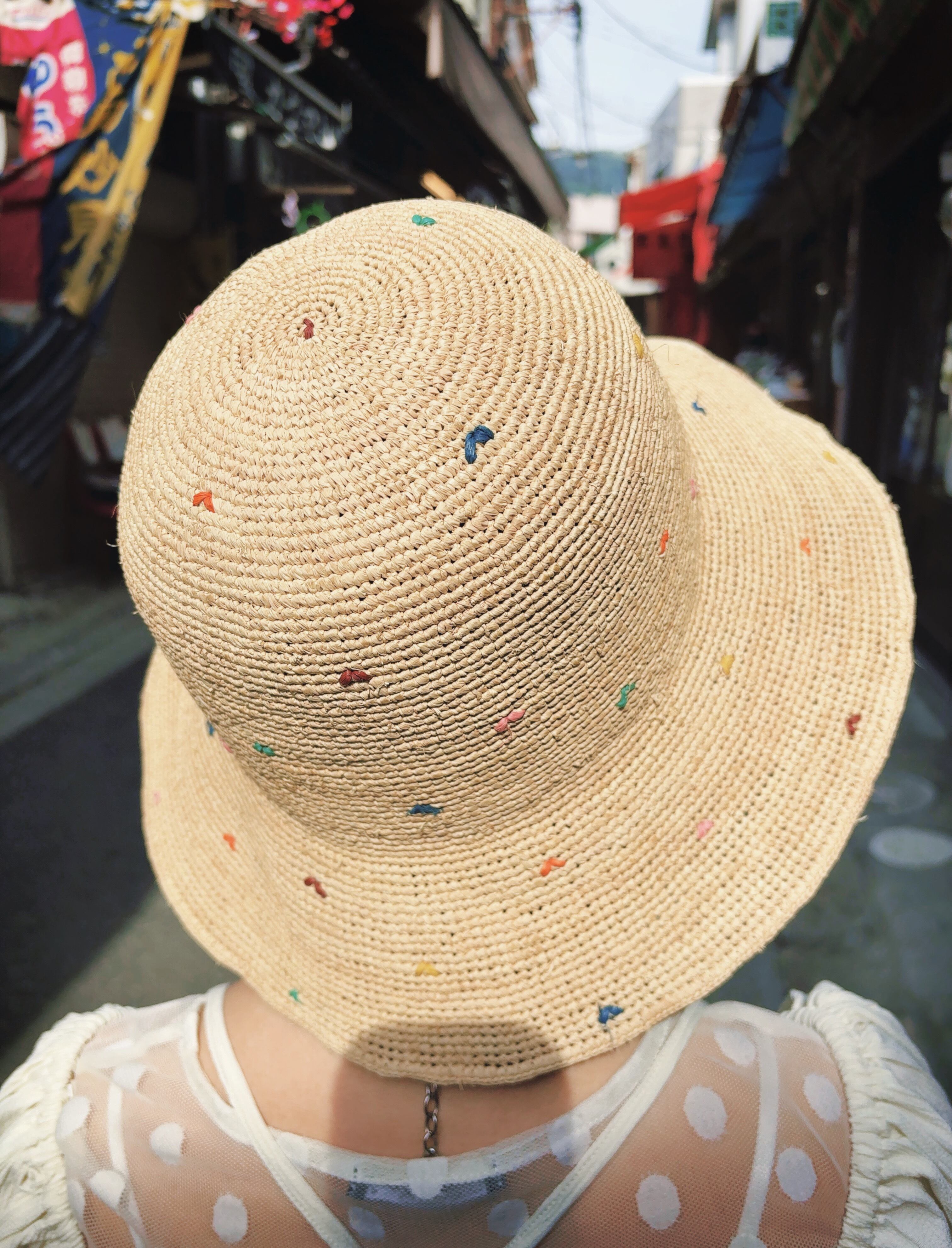 カラフルな刺繍入りのラフィアハットです。つば広で日除けもしっかりできます。