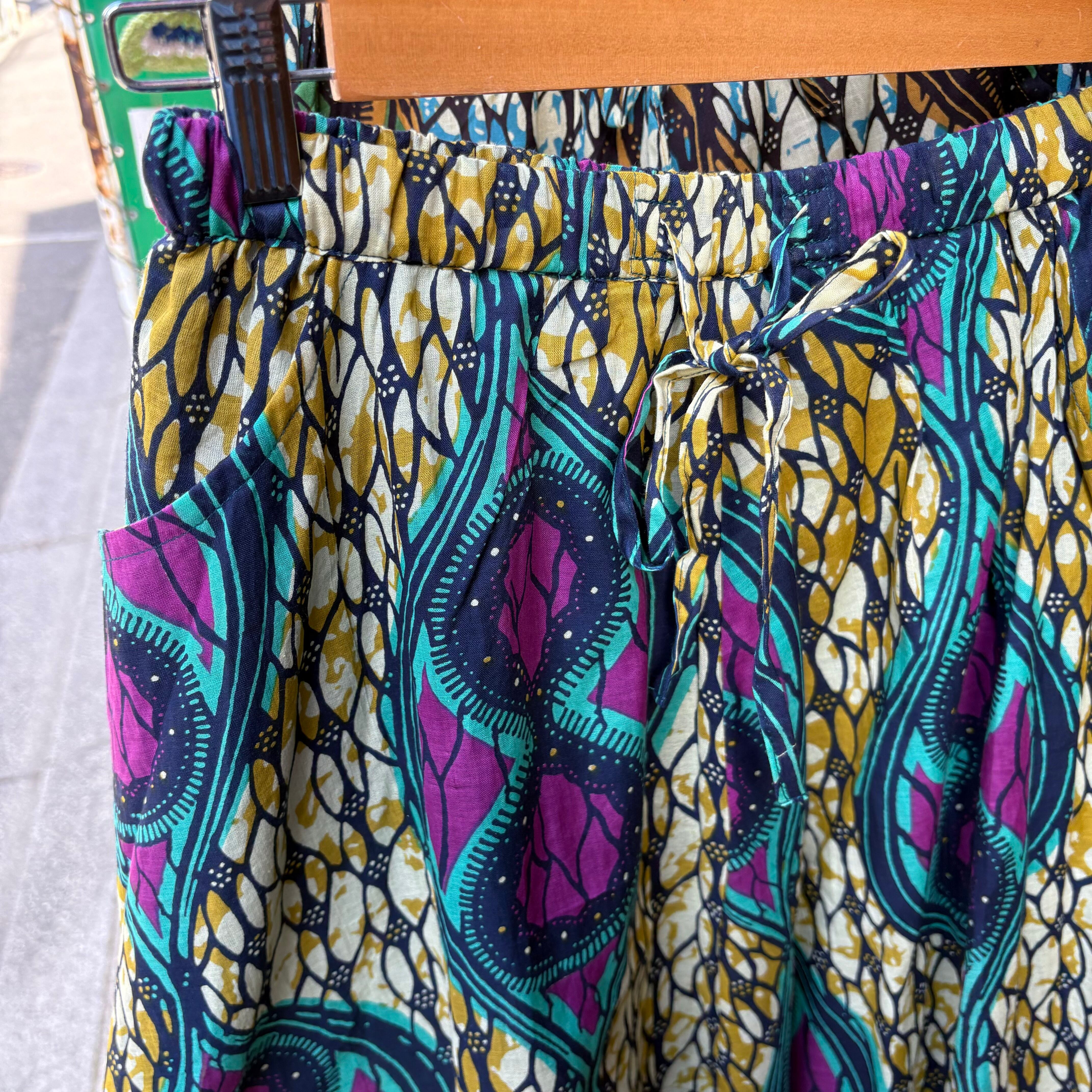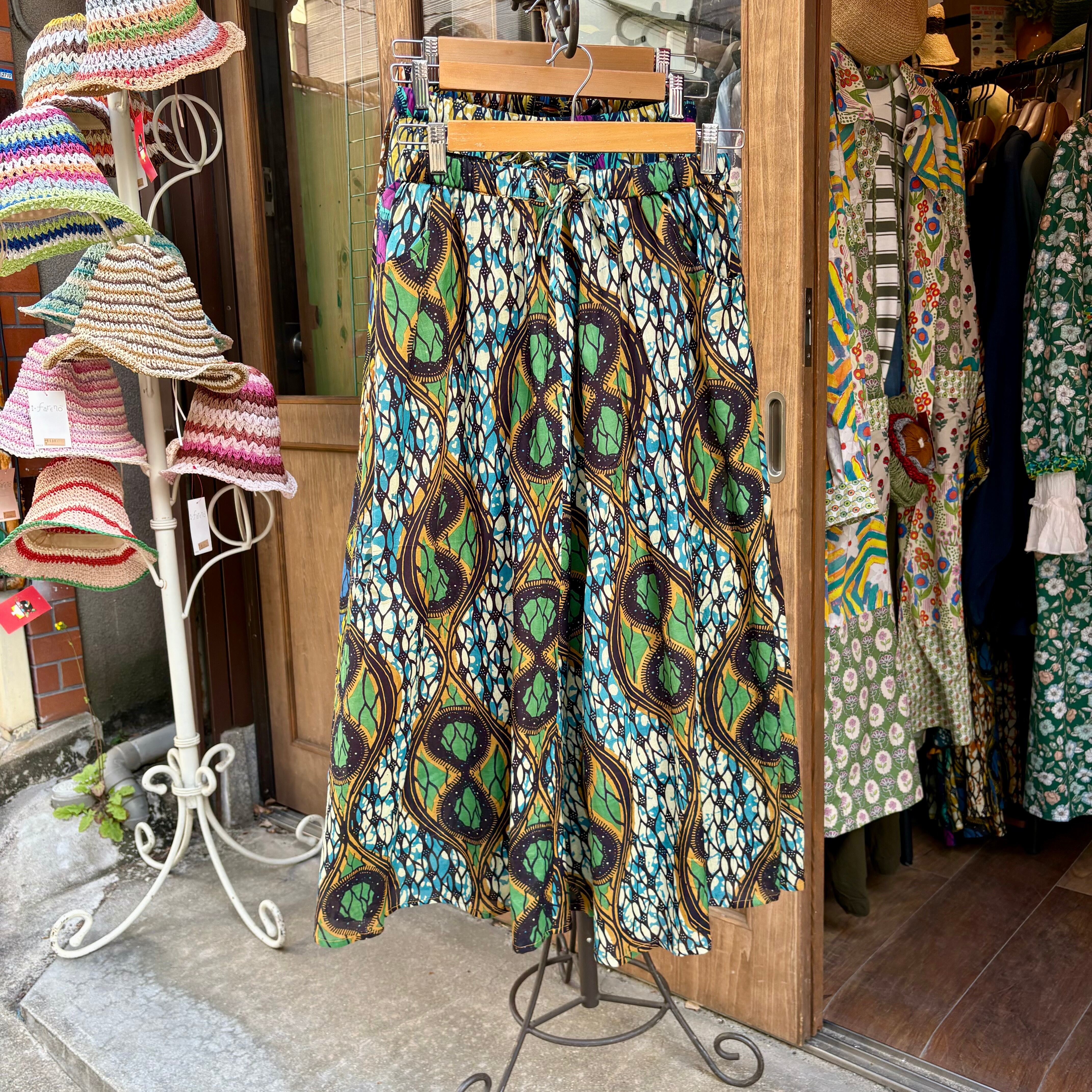 インド綿の柄スカートです。ふんわりAラインにウエストゴム、ポケットと裏地付きです。