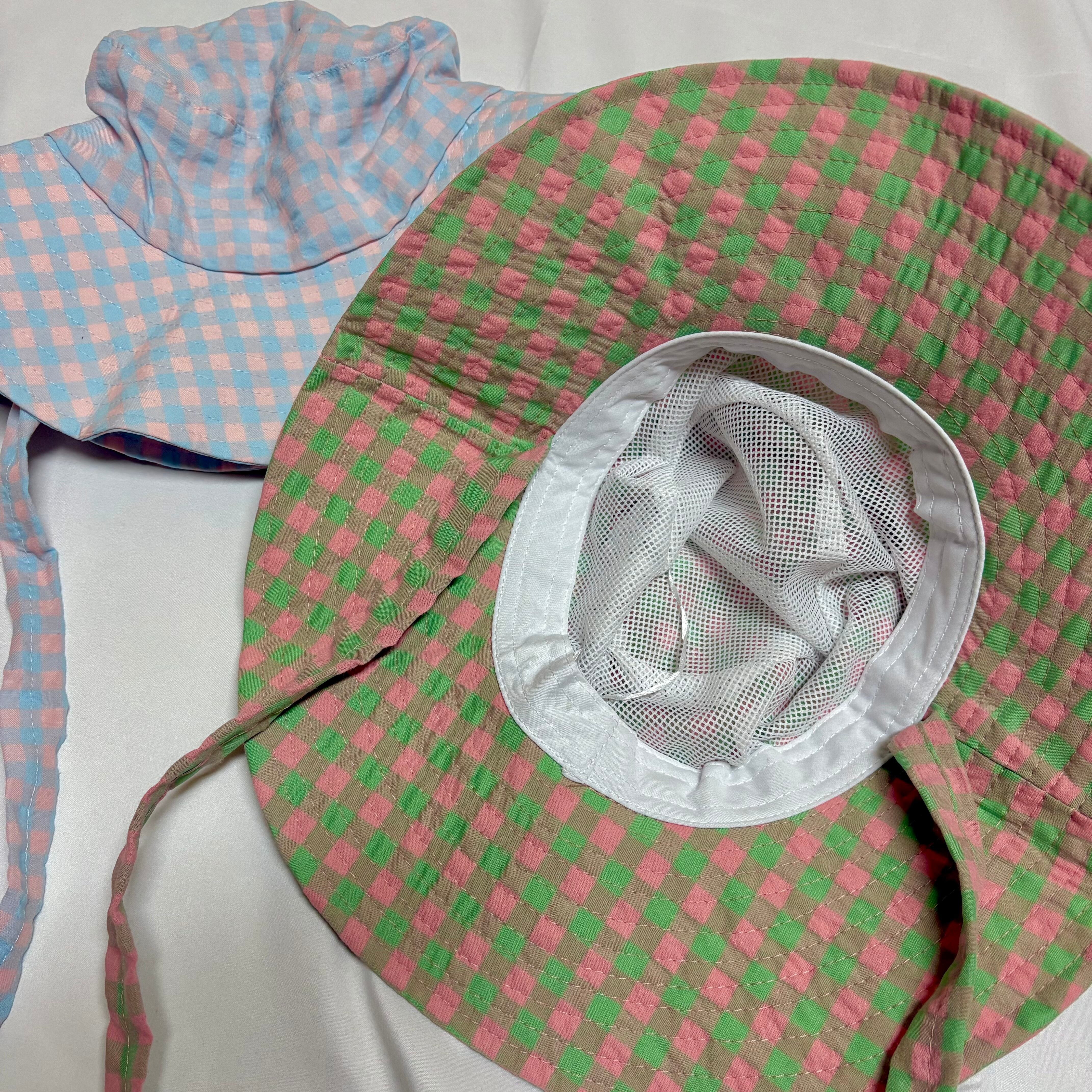 パステルカラーのギンガムチェックに紐付きがレトロなハットです。つば広なので日除けも◎