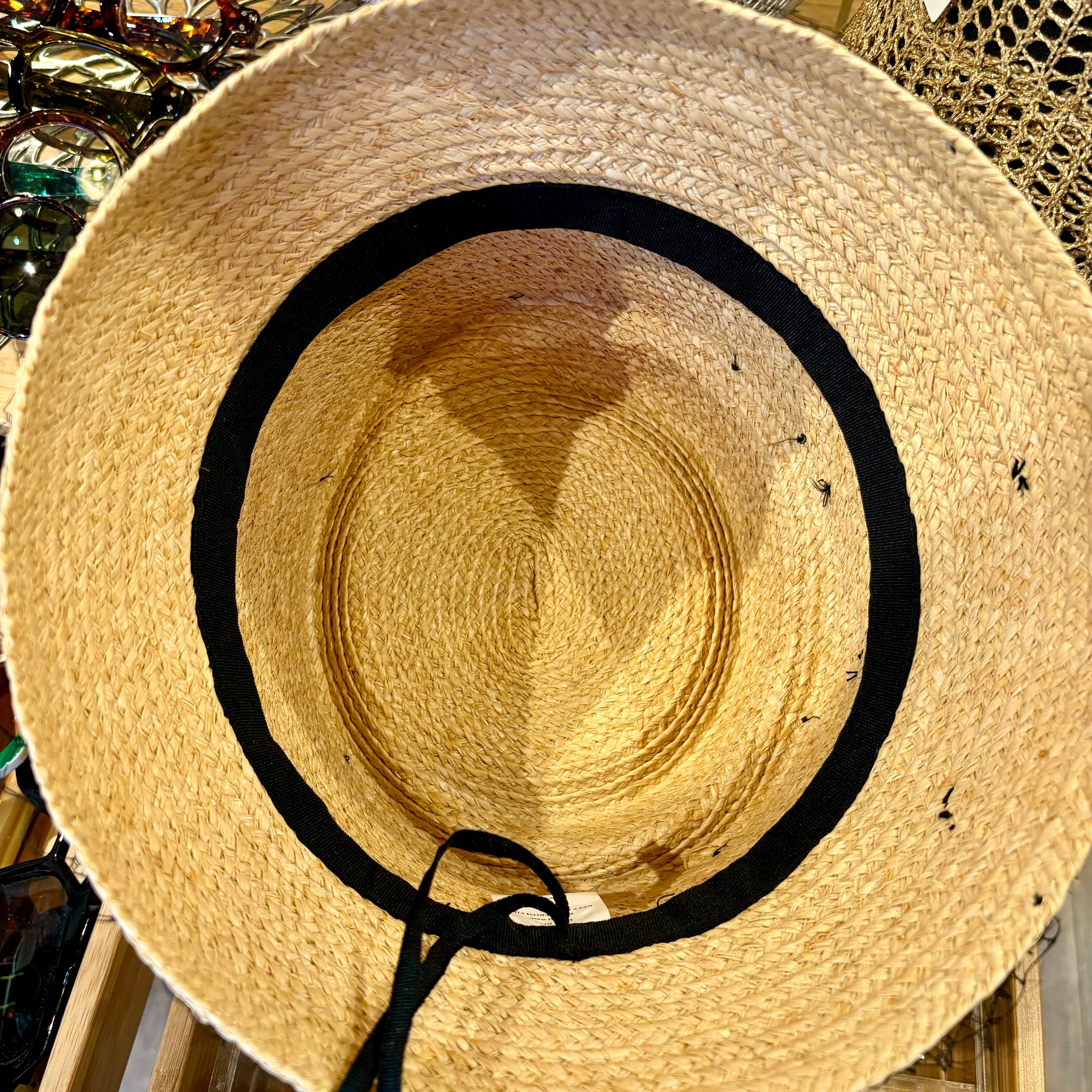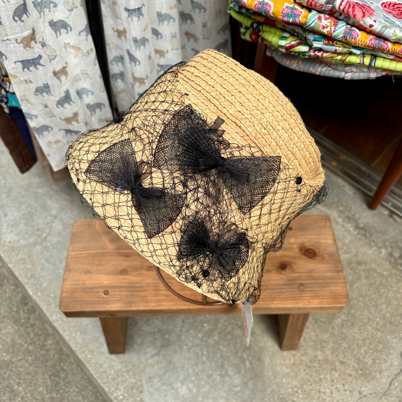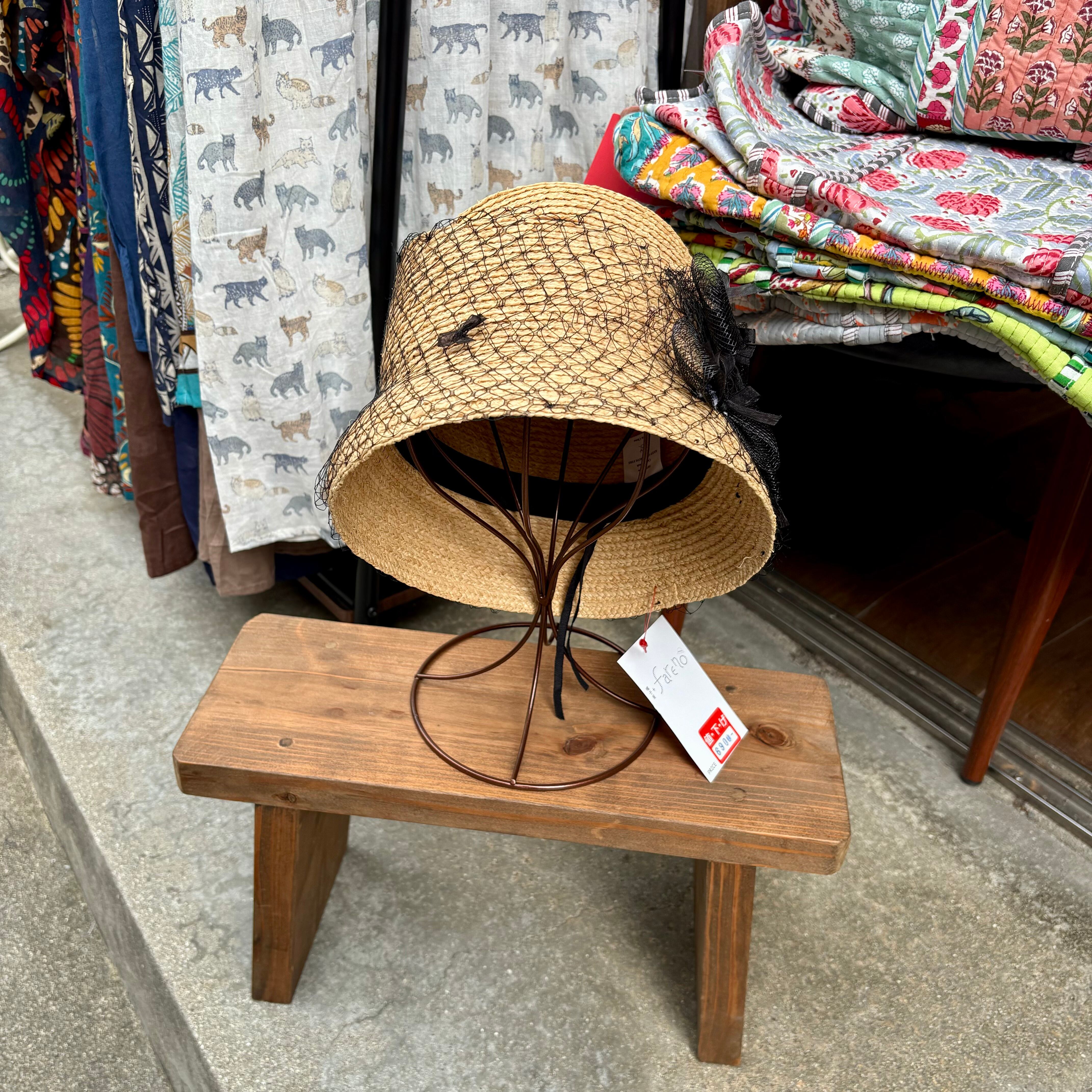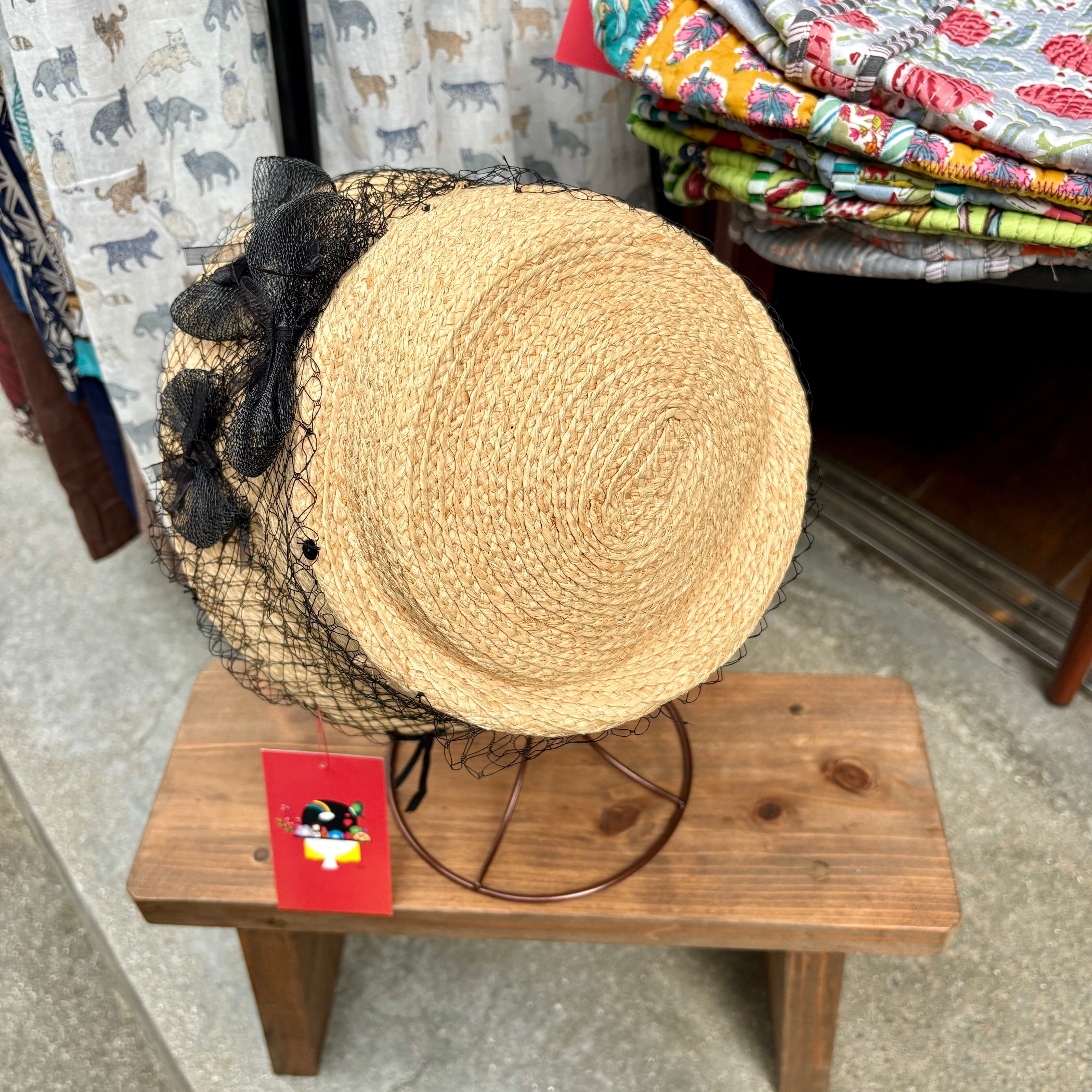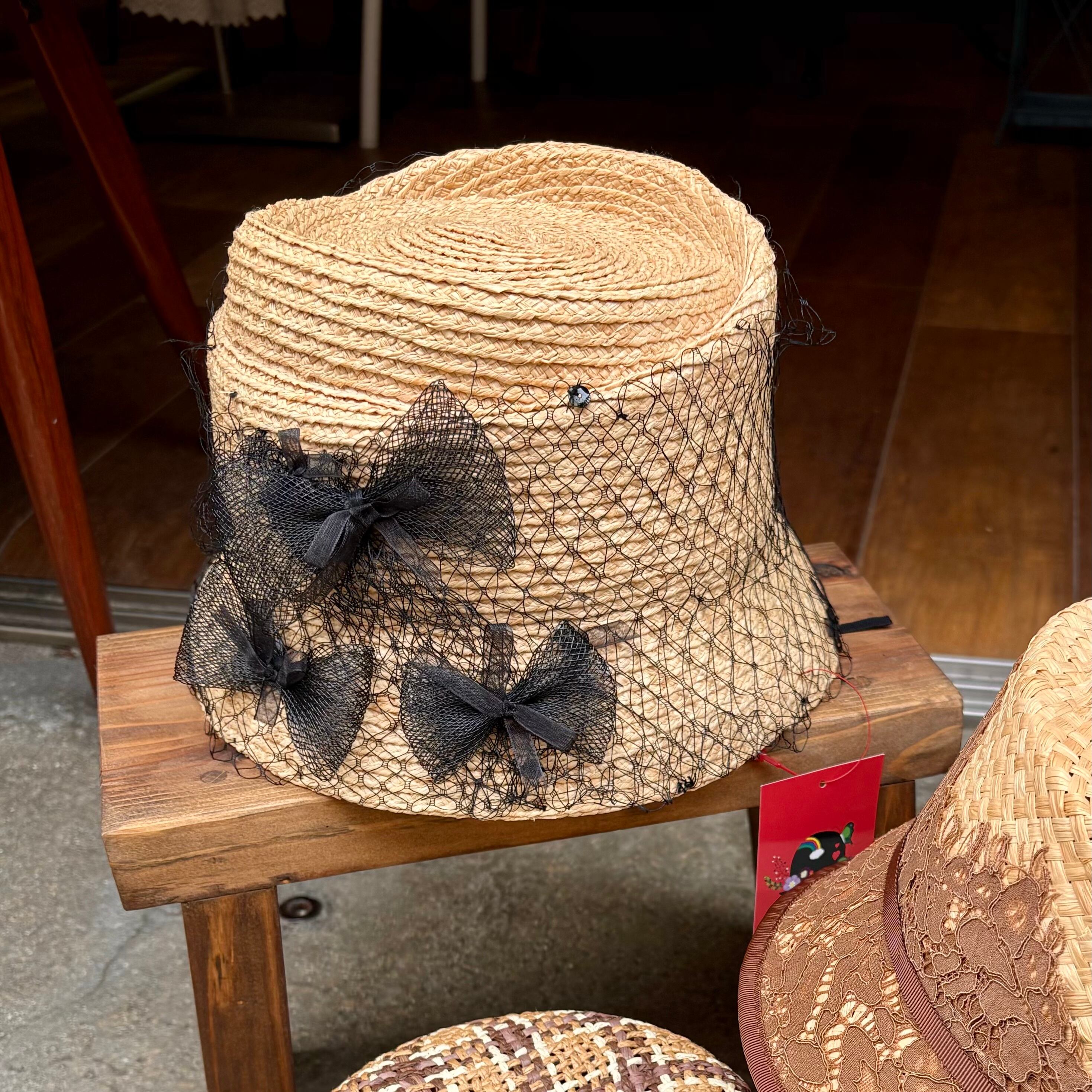 チュールリボンやネットに変形のラフィアハットが特徴的なハットです。