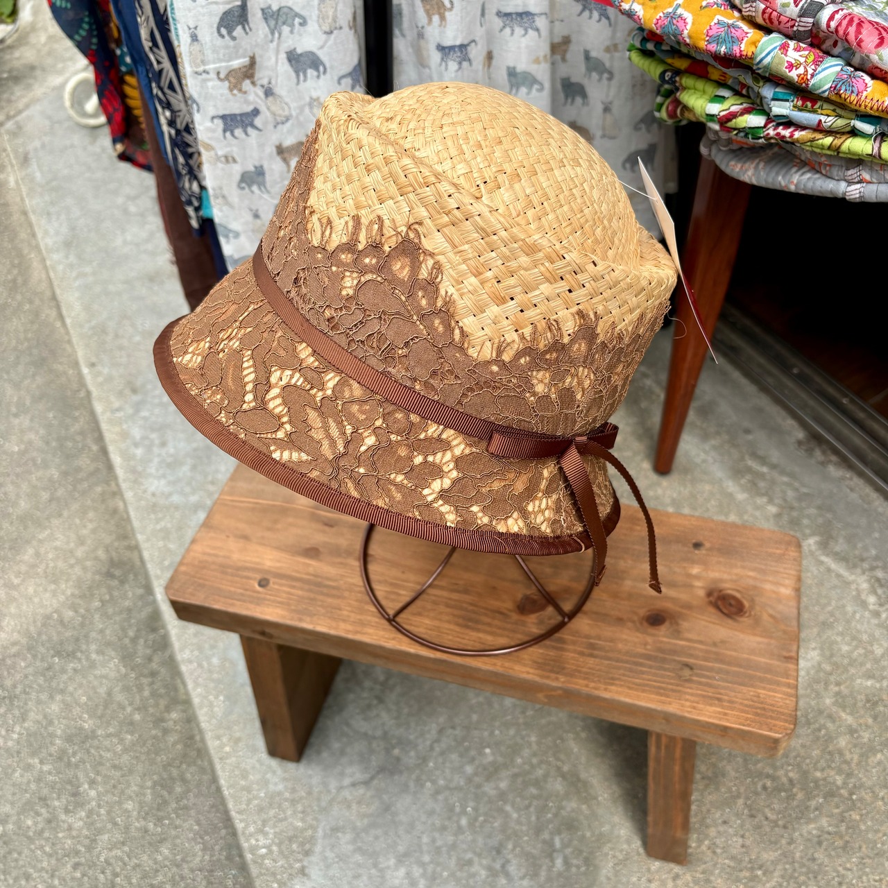レース使いとリボン、形が可愛いラフィアクロシェです。リボンが後ろにくるデザインになっています。