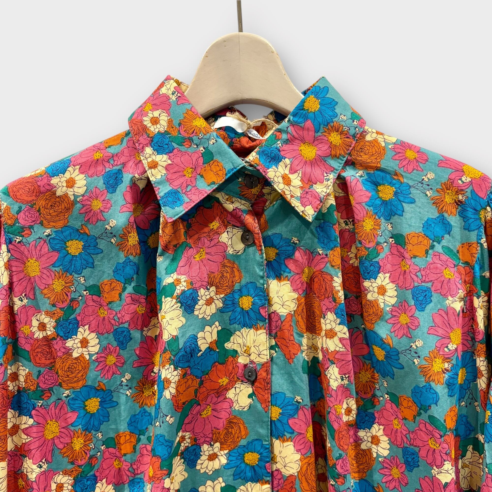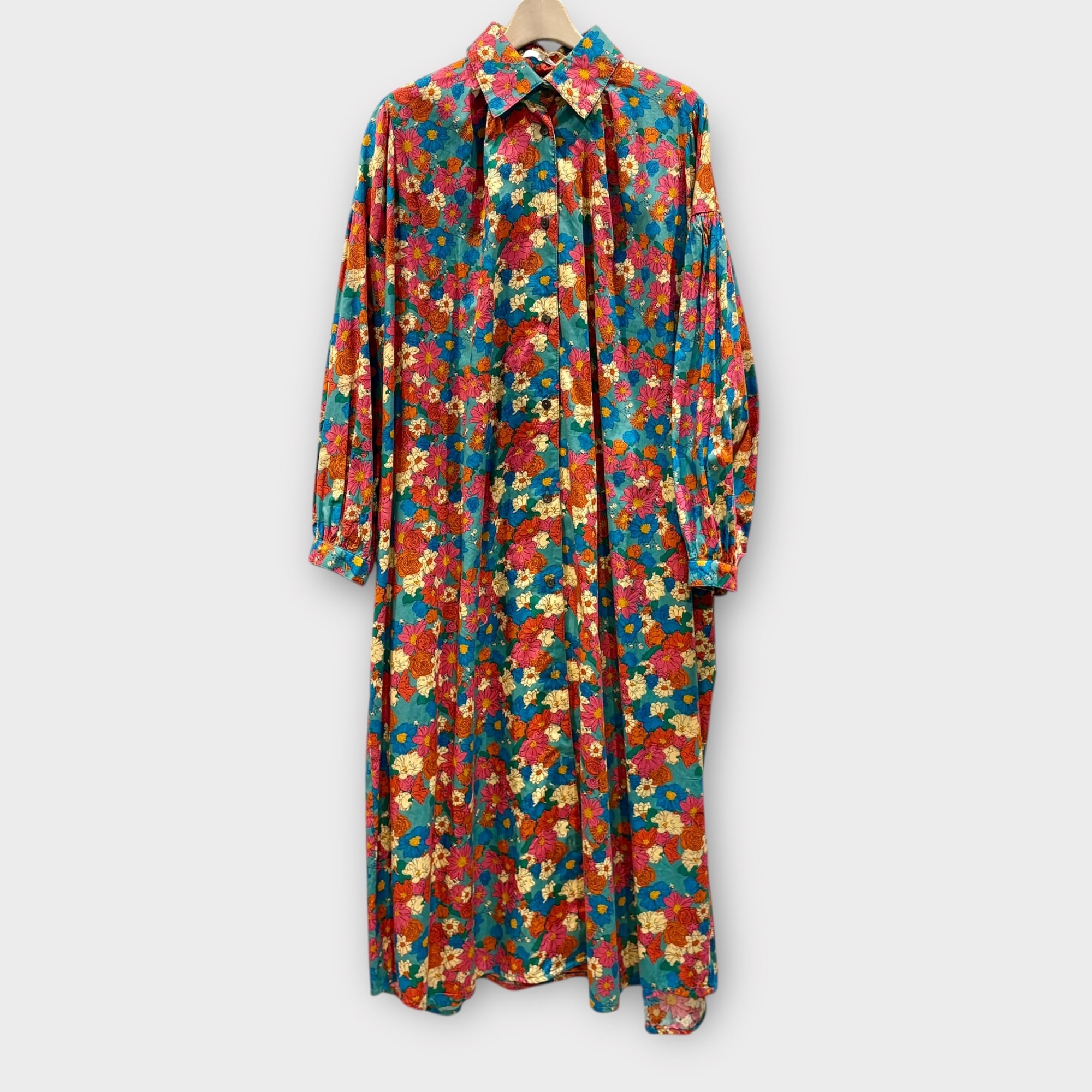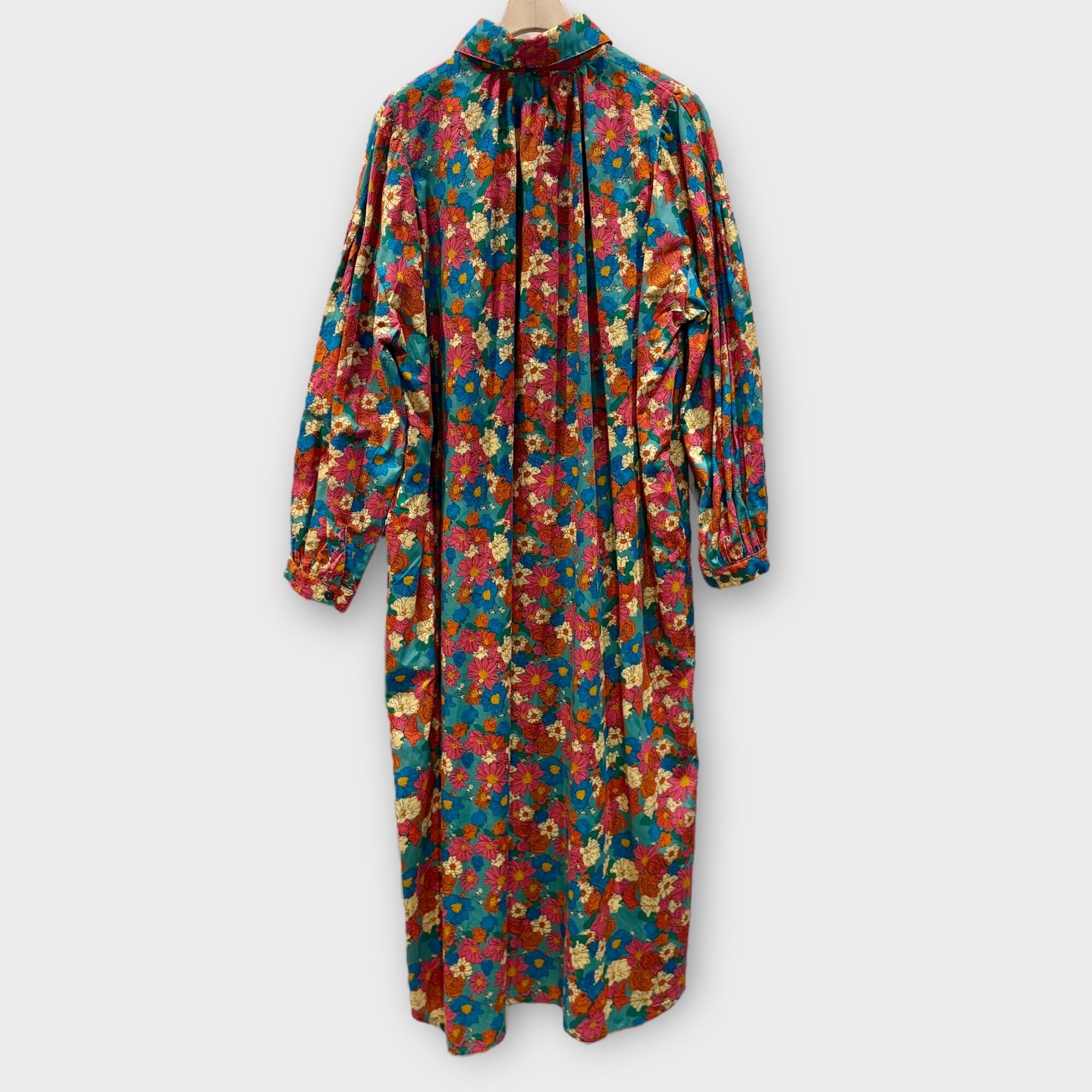 色合いの素敵な花柄プリントのコットンワンピース。たっぷり入ったギャザーが特徴的です。