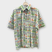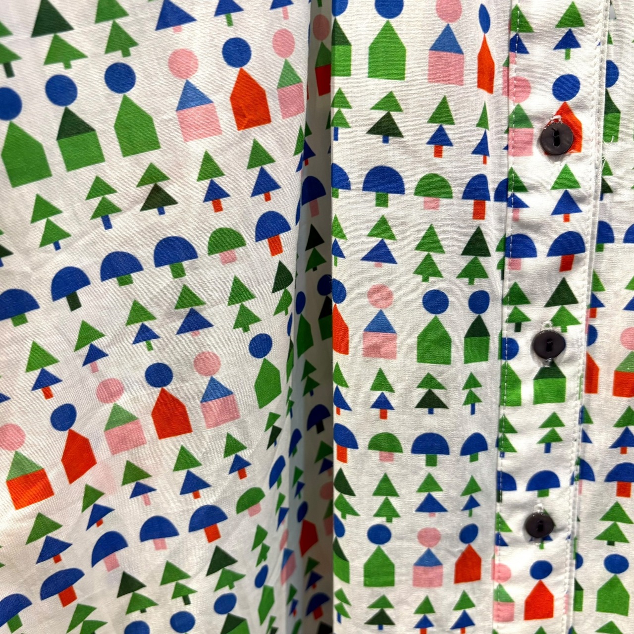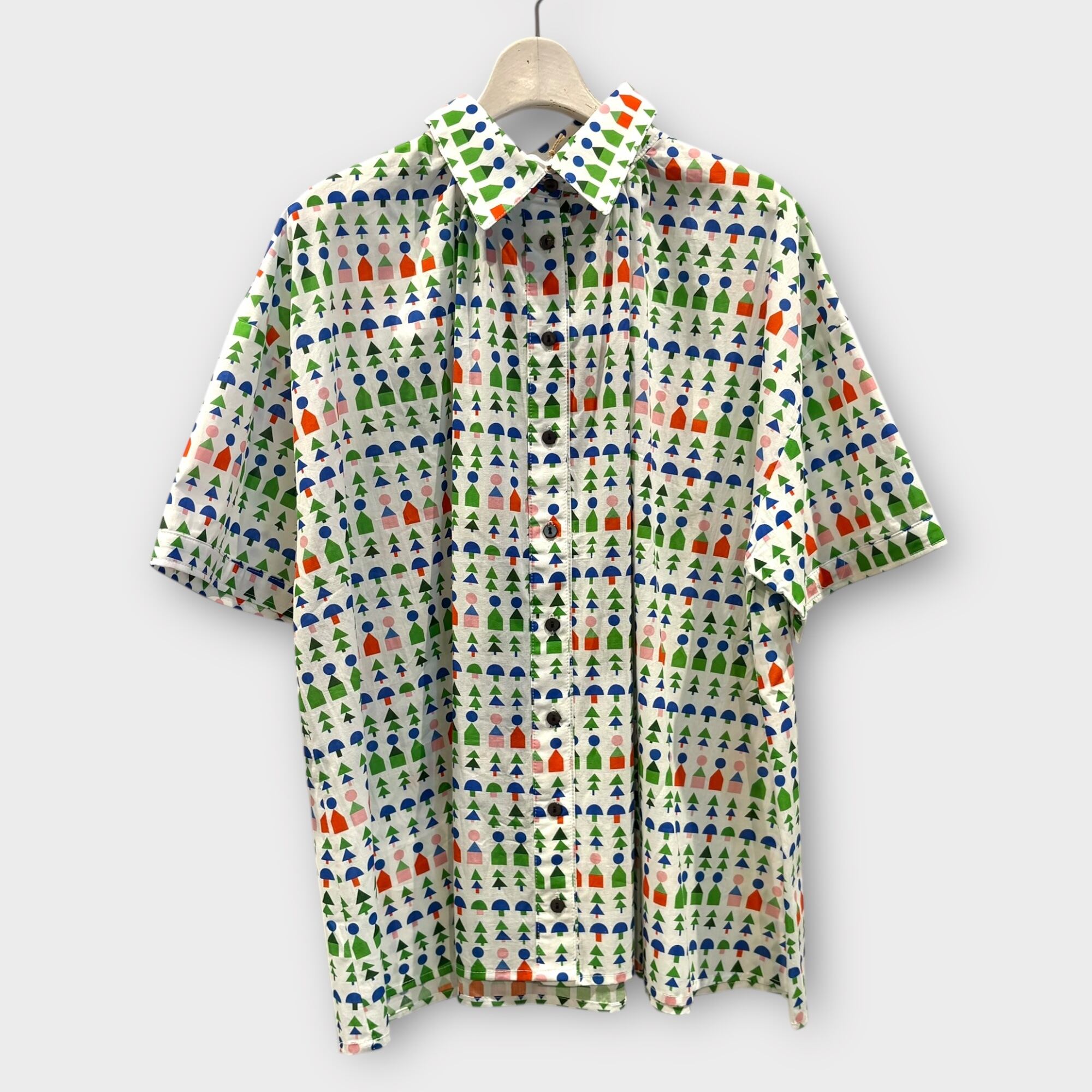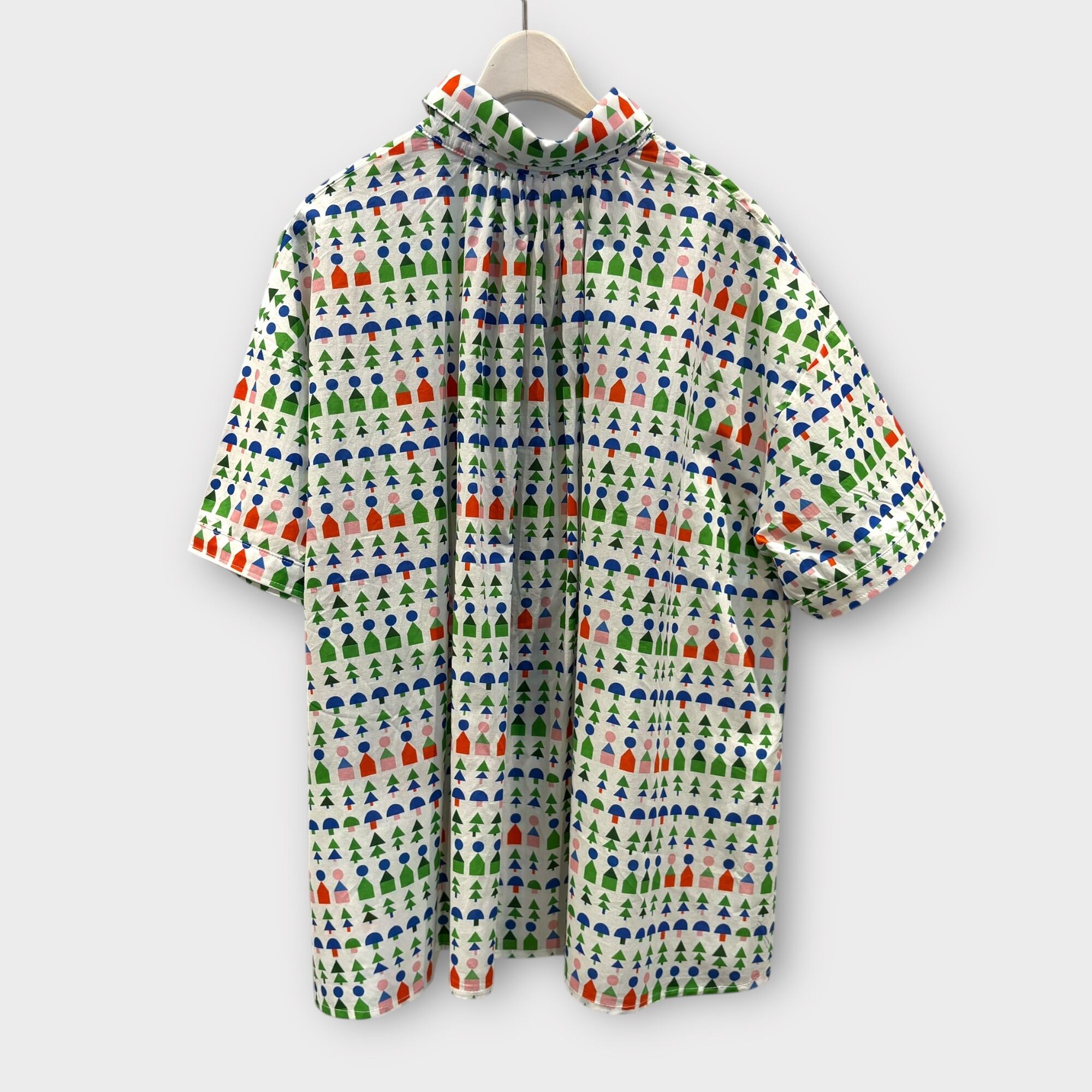ポップな森柄。レギュラーカラーにギャザーの入ったコットンシャツです。