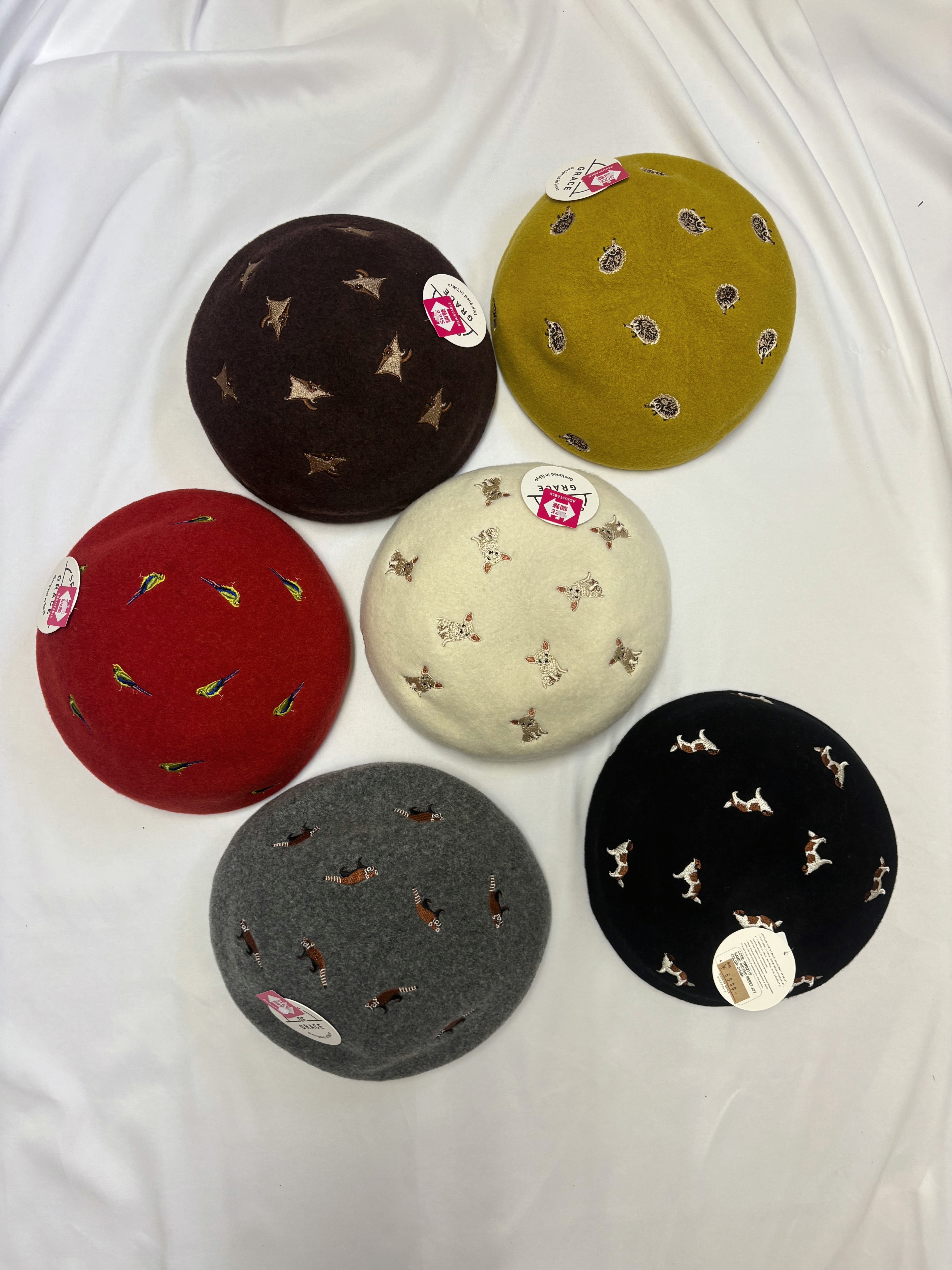 チワワ、レッサーパンダ、コーイケルホンディエ、ハリネズミ、インコ、モモンガ、あまり見かけない種類の刺繍ベレーです。お気に入りが見つかりますように。