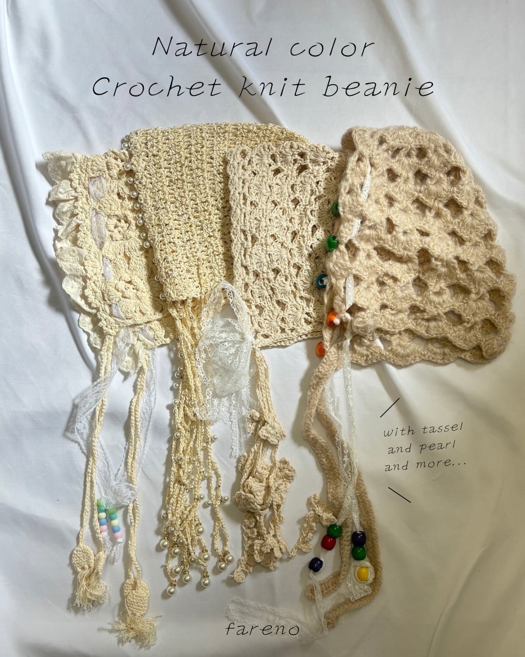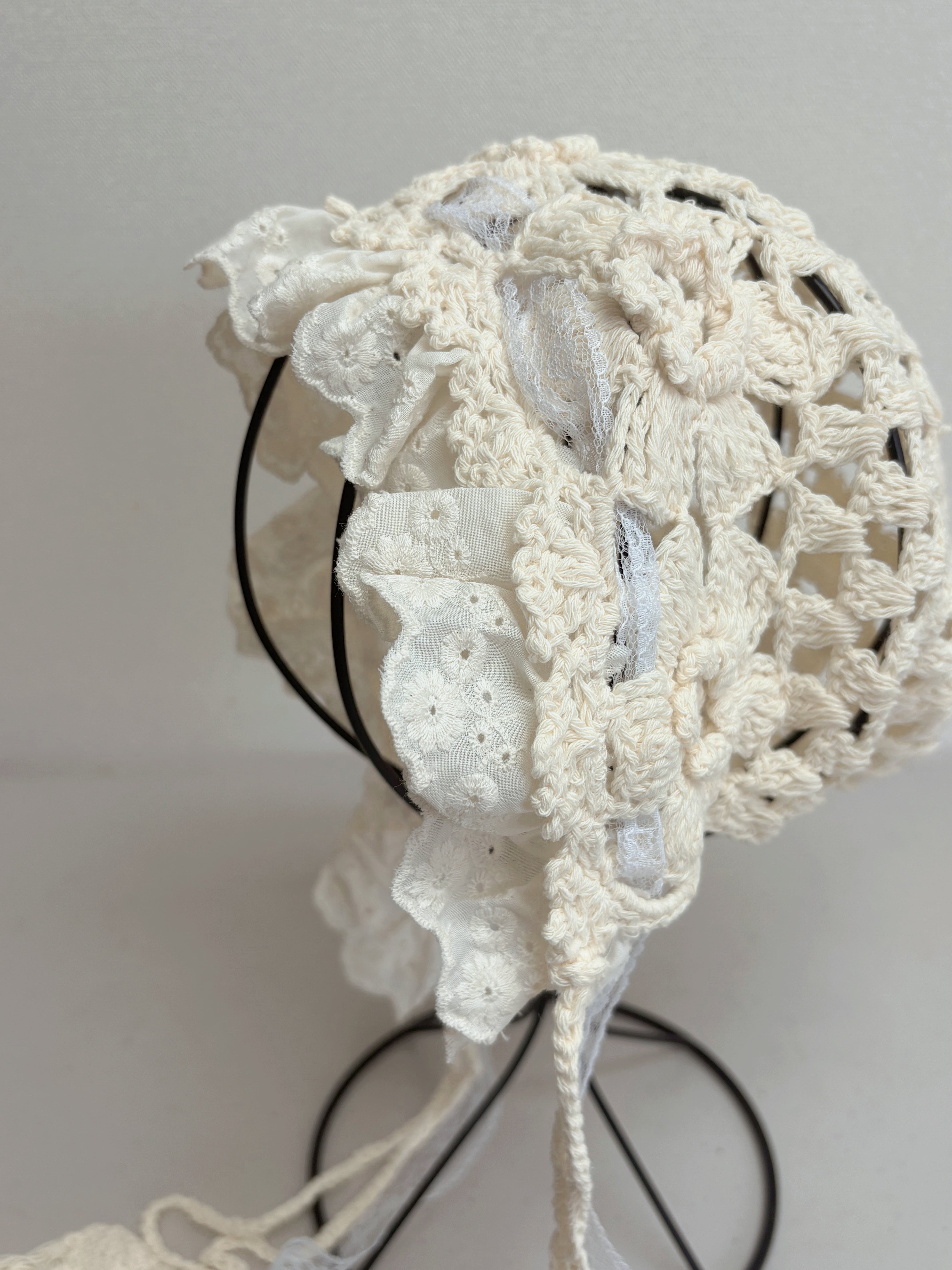 顔周りのレースが特徴的なナチュラルカラーのかぎ編みビーニーです